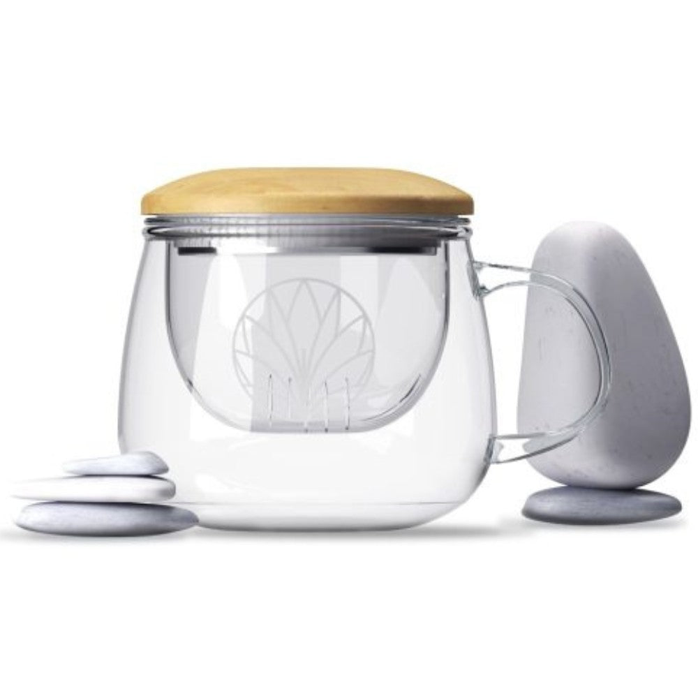 Handgjord och funktionell: Angelica-tekoppen har en värmebeständig glaskanna och en bambulock som även fungerar som en vilbricka för silen. Med en kapacitet på 0,3 liter och minimalistisk design är den perfekt för att njuta av lösbladiga teer eller örtblandningar medan du ser färgen utvecklas genom dess kristallklara kropp.